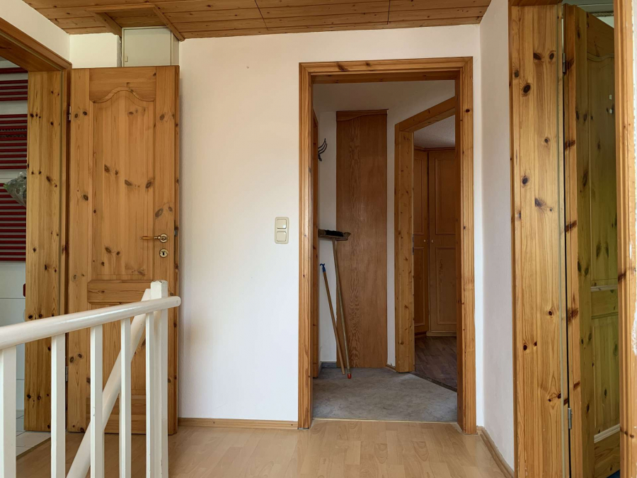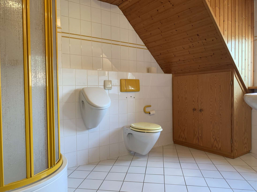 Bodenbeläge im Obergeschoss in PVC, Laminat und Fliesen;